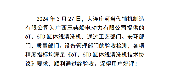 熱烈祝賀廣西玉柴船電動(dòng)力有限公司6T、6TD缸體線清洗機(jī)順利通過(guò)終驗(yàn)收!